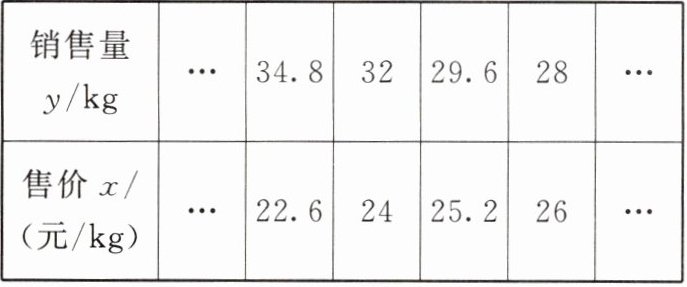 | 售价$$ x / $$(元$$ / \mathrm { kg } $$) | $$ … $$ | $$ 22.6 $$ | $$ 24 $$ | $$ 25.2 $$ | $$ 26 $$ | $$ … $$ |