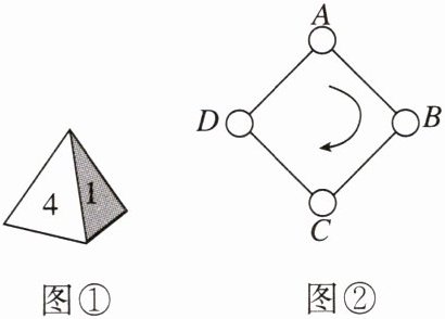 如图②,正方形 $ABCD$ 顶点处各有一个圈。跳圈游戏的规则:游戏者每掷一次骰子,骰子着地一面上的数字是几,就沿正方形的边顺时针方向连续跳几个边长。