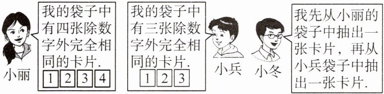 (1)分别用 $ a,b $ 表示小冬从小丽、小兵的袋子中抽出的卡片上标有的数字,请用画树状图法或列表法写出 $ (a,b) $ 的所有取值。