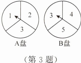 3. 甲、乙两人用如图所示的两个转盘(每个转盘被分成面积相等的 3 个扇形)做游戏。游戏规则:转动两个转盘各一次,当转盘停止后,指针所在区域的数字之和为偶数时甲获胜;数字之和为奇数时乙获胜。若指针落在分界线上,则需要重新转动转盘。甲获胜的概率是( )。