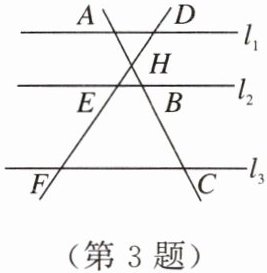 3. 如图,直线$l_{1}// l_{2}// l_{3}$,直线$AC分别交l_{1}$,$l_{2}$,$l_{3}于点A$,$B$,$C$,直线$DF分别交l_{1}$,$l_{2}$,$l_{3}于点D$,$E$,$F$,$AC与DF相交于点H$。如果$AH = 2$,$BH = 1$,$BC = 5$,那么$\frac{DE}{EF}$的值为( )。