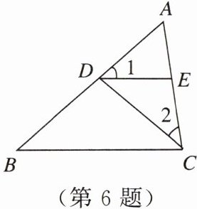 6. 如图,点 $D$,$E$ 分别在 $\triangle ABC$ 的边 $AB$,$AC$ 上,且 $\angle 1 = \angle 2 = \angle B$,则图中相似三角形有____对.