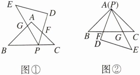 (2) 若使 $\triangle DEP$ 的顶点 $P$ 与顶点 $A$ 重合(如图②),$PD$,$PE$ 分别与 $BC$ 相交于点 $F$,$G$. 试问 $\triangle PBG$ 与 $\triangle FCP$ 还相似吗?为什么?