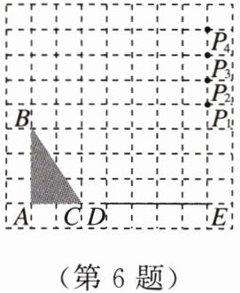 6. 如图,在方格纸中,$\triangle ABC和\triangle EPD$的顶点均在格点上,要使$\triangle ABC\backsim\triangle EPD$,则点$P$所在的格点为( )。