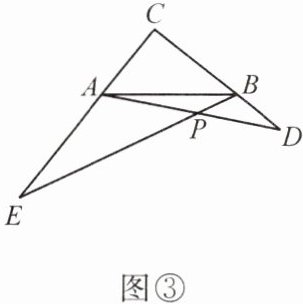 (3)如图③,若$k= \sqrt{3}$,且$D$,$E分别在CB$,$CA$的延长线上,(2)中的结论是否成立?请说明理由。