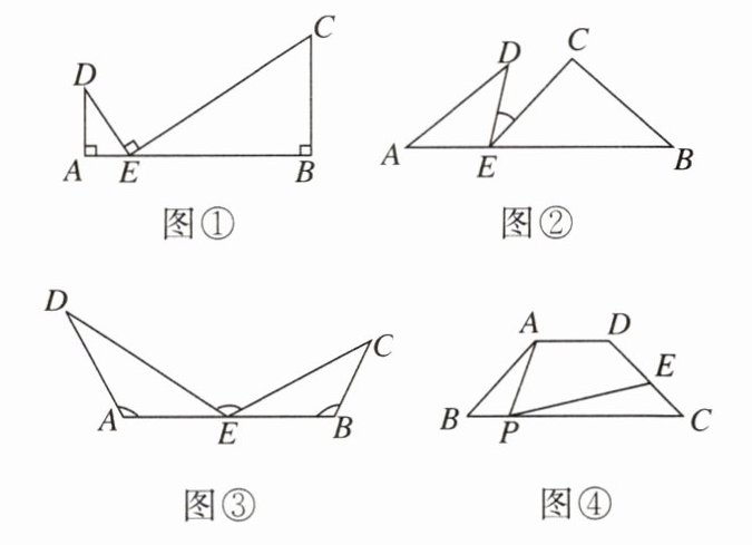(3)运用:如图④,四边形$ABCD$是等腰梯形,$AD// BC$,$AB = 4$,$BC = 9$,$P为BC$边上一动点(不与点$B$,$C$重合),连接$AP$,过点$P作PE交CD于点E$,使得$\angle APE= \angle ABC$,则当$BP= $____时,点$E为CD$的中点。