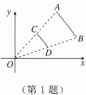 1. 如图,线段 $ AB $ 的两个端点分别为 $ A(6,6) $,$ B(8,2) $,以原点 $ O $ 为位似中心,在第一象限内将线段 $ AB $ 缩小为原来的 $ \dfrac{1}{2} $ 后得到线段 $ CD $,则端点 $ C $ 的坐标为( )。