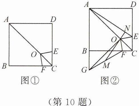 10. 如图①,在正方形$ABCD$中,点$E在边CD$上,点$O在对角线AC$上,$OF\perp OE交BC于F$。