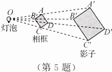 5. 如图,小芸用灯泡$O照射一个矩形相框ABCD$,在墙上形成影子$A'B'C'D'$. 现测得$OA = 20\ cm$,$OA' = 50\ cm$,相框$ABCD的面积为80\ cm^2$,则影子$A'B'C'D'$的面积为______.