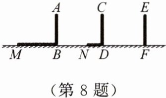 8. 如图,电线杆上有一盏路灯$O$,电线杆与三个等高的标杆整齐划一地排列在马路的一侧,$AB$,$CD$,$EF$是三个标杆.