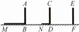 如图,$AB$,$CD$,$EF$是与路灯在同一直线上的三个等高的标杆,相邻的两个标杆之间的距离都是$2\ m$,已知$AB$,$CD在路灯光下的影长分别为BM = 1.6\ m$,$DN = 0.6\ m$,求标杆$EF$的影长.