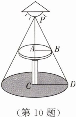 10. 如图,在圆桌的正上方有一盏吊灯,灯光下,圆桌在地板上的投影是面积为$4\pi\ m^2$的圆. 已知圆桌的高度为$1\ m$,圆桌面的半径为$0.5\ m$,求吊灯到圆桌面的距离.