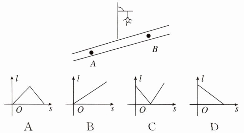 如图,小红居住的小区内有一条笔直的小路,小路的正中间有一路灯,晚上小红由$A处径直走到B$处,她在灯光照射下的影长$l与行走的路程s$之间的变化关系用图象表示出来大致是( ).