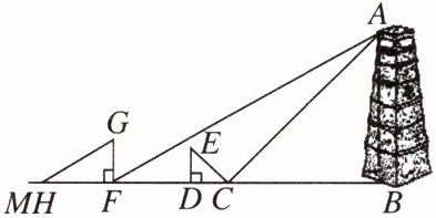 某市为了打造森林城市,树立城市新地标,实现绿色、共享发展的理念,在城南建立起了“望月阁”以及环阁公园。小亮、小芳等同学想用一些测量工具和所学的几何知识测量“望月阁”的高度,来检验自己掌握知识和运用知识的能力。他们经过观察发现,观测点与“望月阁”底部的距离不宜测得,因此经过研究需要测量两次,于是他们首先用平面镜进行测量,方法如下:如图,小芳在小亮和“望月阁”之间的直线 $BM$ 上平放一平面镜,在镜面上做了一个标记,这个标记在直线上的对应的位置为点 $C$,镜子不动。小亮看着镜面上的标记,他来回走动,走到点 $D$ 时看到“望月阁”顶端点 $A$ 在镜面中的像与镜面上的标记重合。这时,测得小亮眼睛与地面的高度 $ED = 1.5$ m,$CD = 2$ m。然后在阳光下,他们用测影长的方法进行了第二次测量,方法如下:如图,小亮从点 $D$ 沿 $DM$ 方向走了 16 m,到达“望月阁”影子的末端点 $F$ 处,此时,测得小亮身高 $FG$ 的影长 $FH = 2.5$ m,$FG = 1.65$ m。
