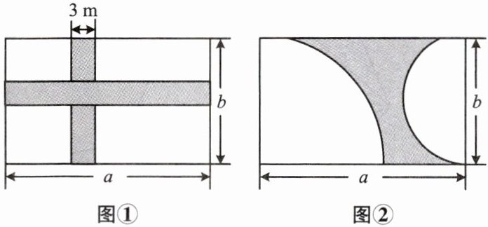 (1)图①中石子路的面积,即阴影部分的面积为(3a+3b−9)m²,图②中石子路的面积,即阴影部分的面积为$ab-\frac{1}{4}\pi b^{2}-\frac{1}{2}\pi×(\frac{b}{2})^{2}=(ab-\frac{3}{8}\pi b^{2})m^{2}$.