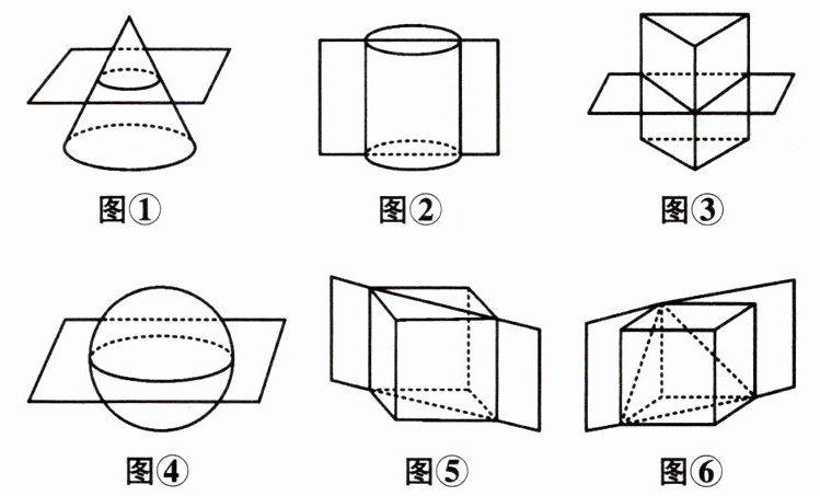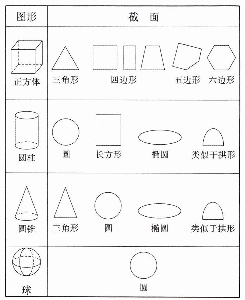 (2)棱柱(以正方体为例)、圆柱、圆锥、球的截面如下: