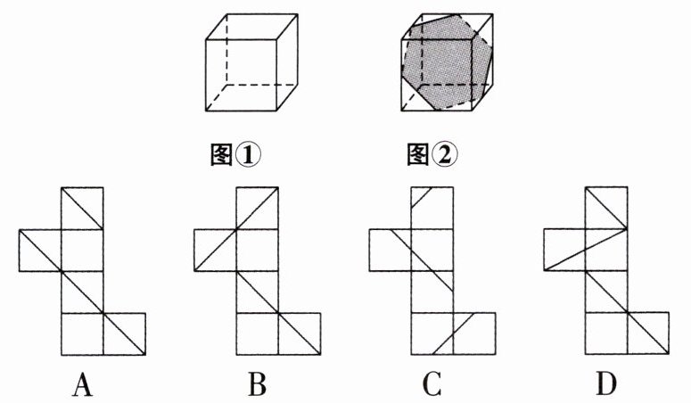 4. 图①是一个正六面体,把它按图②所示方法切割,可以得到一个正六边形的截面. 下列展开图中正确画出了所有的切割线的是(