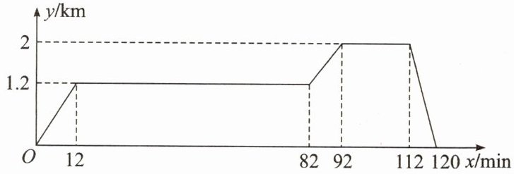 已知学生公寓、阅览室、超市依次在同一条直线上,阅览室离学生公寓$1.2 km$,超市离学生公寓$2 km$.小琪从学生公寓出发,匀速步行$12 min$到阅览室,在阅览室停留$70 min$后,匀速步行$10 min$到超市,在超市停留$20 min$后,匀速骑行$8 min$返回学生公寓.如图所示图象反映了这个过程中小琪离学生公寓的距离$y(km)与离开学生公寓的时间x(min)$之间的对应关系.