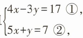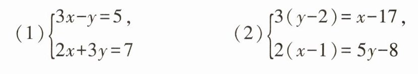 1. 对于方程组$\begin{cases}3x - y = 5&(1)\\2x + 3y = 7&(2)\end{cases}$: