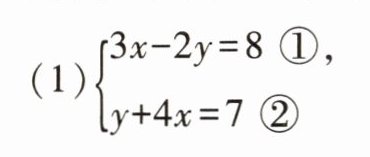 把$③$代入$①$ $3x - 2y = 8$中,得到$3x-2(7 - 4x)=8$。