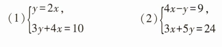 已知方程组$\begin{cases}y = 2x&(1)\\3y+4x = 10&(2)\end{cases}$。