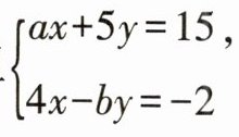 将$a = - 1$,$b = 10$代入原方程组$\begin{cases}ax + 5y = 15\\4x - by = - 2\end{cases}$,得到$\begin{cases}-x + 5y = 15&(1)\\4x - 10y = - 2&(2)\end{cases}$。