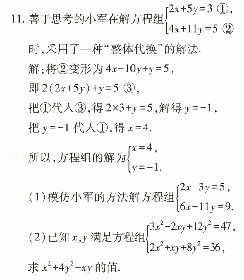 综上,$(1)$方程组的解为$\boldsymbol{\begin{cases}x = 7\\y = 3\end{cases}}$;$(2)$$x^{2}+4y^{2}-xy$的值为$\boldsymbol{15}$。