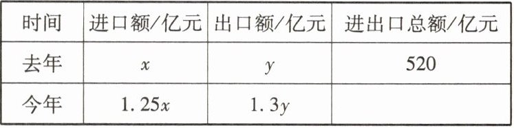 (2)由题意可得{x+y=520,1.25x+1.3y=520+140,解得{x=320,y=200,1.25x=400,1.3y=260.答:今年的进口额是400亿元,出口额是260亿元.