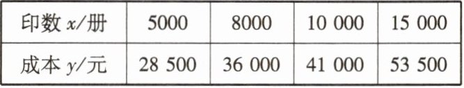 (1)经过对上表中数据的探究,发现这种读物的投入成本$y$(元)是印数$x$(册)的一次函数,求这个一次函数的表达式(不要求写出$x$的取值范围).