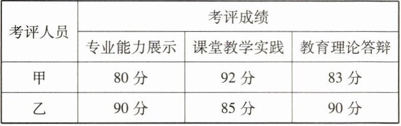 学校在招聘1位体育教师时,以综合考评成绩确定人选。甲、乙两位体育院校毕业生的各项考评成绩如下表: