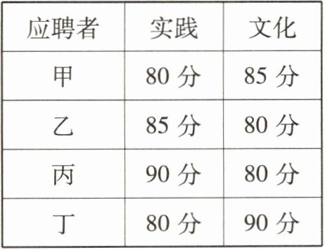 2. 某纪念馆计划招聘1名工作人员,评委从实践、文化两个方面为甲、乙、丙、丁4位应聘者打分(具体分数如表),按实践成绩占$40\%$、文化成绩占$60\%$计算应聘者综合得分,并录用综合得分最高者。最终录用的应聘者是(