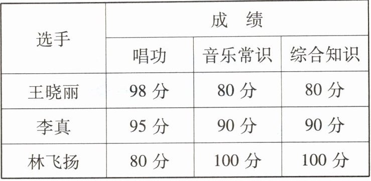 5. 在某张音乐比赛成绩的统计表上,王晓丽、李真、林飞扬3人的成绩如下: