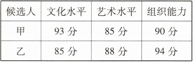 4. 某校学生会要在甲、乙两名候选人中选择一人担任文艺部干事,对他们进行了文化水平、艺术水平、组织能力的测试,根据综合成绩择优录取。他们的各项成绩(单项满分100分)如表所示: