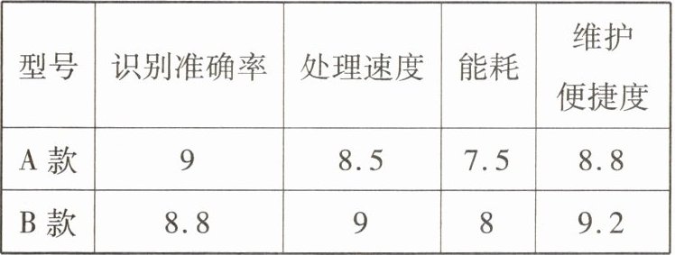 5. 某城市大力推广垃圾分类,为评估A,B两款智能垃圾分类设备的性能,工作人员对两款设备在识别准确率、处理速度、能耗、维护便捷度4个方面进行评分,A,B两款设备各项评分如下表: