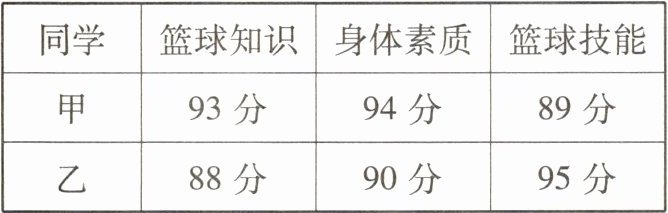 6. 自“双减”以来,同学们的课后延时服务活动丰富多彩。某学校在新的学期举办篮球特色班,大量同学踊跃报名,但由于名额有限,因此需要考核。考核的最终评价成绩由篮球知识、身体素质、篮球技能3项构成。下表是对甲、乙两名同学成绩的记录: