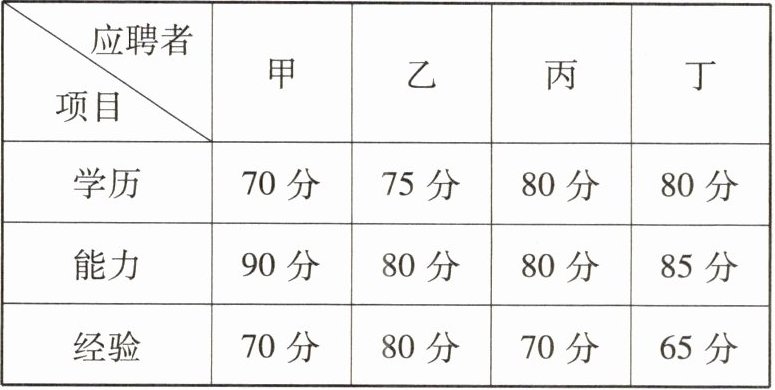 2. 某公司要招聘一名职员,根据实际需要从学历、能力、经验3个方面对甲、乙、丙、丁4名应聘者进行了测试,测试成绩如下表: