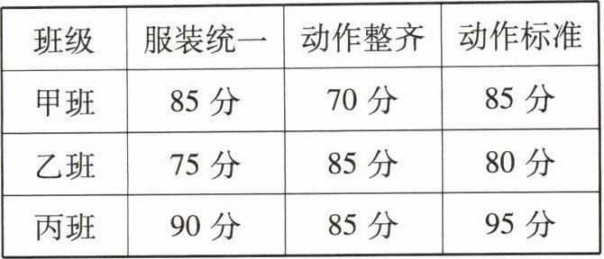 8. 在一次广播操比赛中,甲班、乙班、丙班在服装统一、动作整齐、动作标准3项的得分(百分制)如下表: