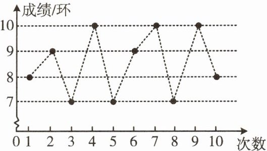 5. 甲、乙两射击运动员各进行10次射击,甲的成绩(单位:环)是8,8,8,9,8,9,10,9,9,9,乙的成绩如图所示.甲、乙射击成绩的方差之间的关系是$s_{甲}^{2}$