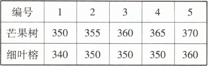 芒果树方差为$[(350-360)^{2}+(355-360)^{2}+(360-360)^{2}+(365-360)^{2}+(370-360)^{2}]÷5=50$,