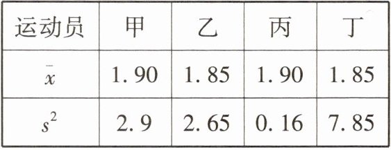 3. 甲、乙、丙、丁4名跳高运动员最近几次选拔赛成绩的平均数$\overline{x}与方差s^{2}$如下表所示。