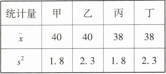 6. 某村欲购进一批杏树,随机从甲、乙、丙、丁4个品种中各选了10棵,每棵产量(单位:kg)的平均数$\overline{x}及方差s^{2}$如表所示。该村准备从这4个品种中选出一种产量既高又稳定的杏树,则应选的品种是