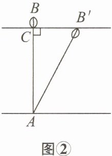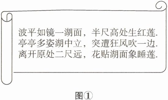 11. (吉林中考)图①中有一首诗,根据诗中的描述可以计算出红莲所在位置的湖水深度,示意图如图②,其中$AB = AB'$,$AB \perp B'C于点C$,$BC = 0.5$尺,$B'C = 2$尺。设$AC的长度为x$尺,则可列方程