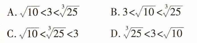 ).A.$\sqrt{10}<3<\sqrt[3]{25}$