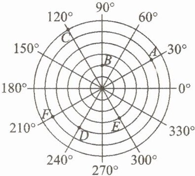 3. 如图,雷达探测器发现了 A,B,C,D,E,F 这 6 个目标.目标 C,F 的位置分别表示为 $ C ( 6, 120 ^ { \circ } ) $,$ F ( 5, 210 ^ { \circ } ) $.按照此方法表示目标 A,B,D,E 的位置,下列选项表示正确的是(