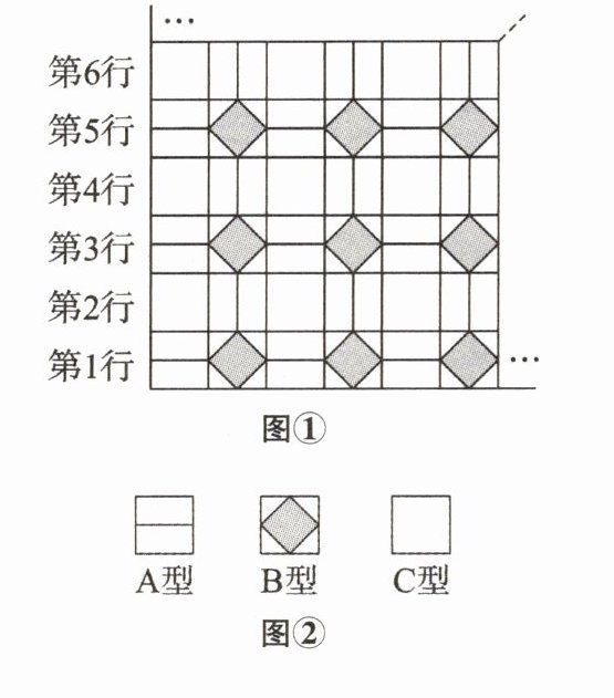 10. 如图①,某广场地面是用 A,B,C 这 3 种类型的地砖铺成的.3 种类型地砖表面上的图案如图②所示.现用有序数对表示每一块地砖的位置:第 1 行的第 1 块地砖(A 型)记作 $ ( 1, 1 ) $,第 2 块地砖(B 型)记作 $ ( 2, 1 ) $……若 $ ( m, n ) $ 的位置恰好为 A 型地砖,求正整数 m,n 满足的条件.