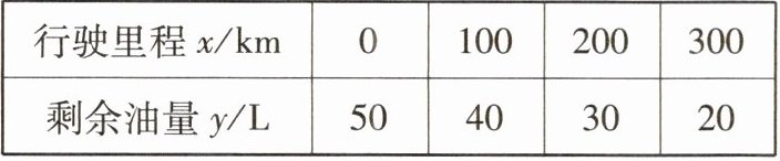 4. 汽车在公路上行驶时,油箱中剩余油量 $ y(L) $ 是行驶的里程 $ x(km) $ 的函数。小丽记录了一次远行时汽车行驶的里程及油箱中剩余的油量,数据如下表: