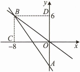 8. 如图,一次函数 $ y_1 = ax + b $ 的图象与 $ y $ 轴负半轴相交于点 $ A $,与正比例函数 $ y_2 = kx $ 的图象交于点 $ B(-8,6) $,且 $ OA = \frac{1}{2}OB $。
