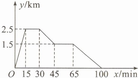 1. 已知张强家、体育场、文具店在同一直线上, 如图所示图象反映的过程是: 张强从家跑步去体育场, 在那里锻炼了一阵儿后又走到文具店去买笔, 然后散步回家. 图中的$x$表示时间,$y$表示张强离家的距离, 下列结论不正确的是(