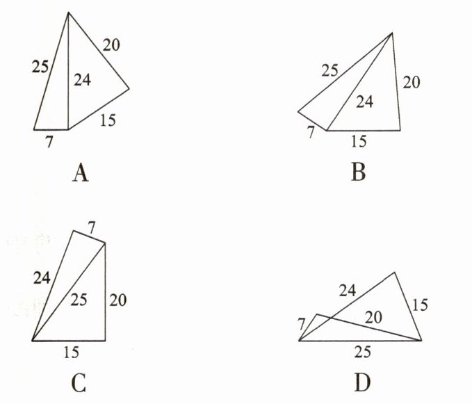 2. 已知 5 根小木棒的长度分别为 $ 7,15,20,24,25 $,现将它们摆成两个直角三角形,下列摆法正确的是(
