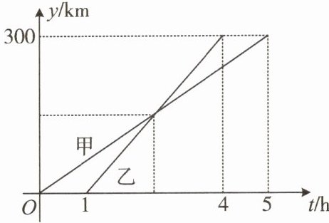 1. 甲、乙两车沿着相同路线从A地前往B地,两车行驶的路程y(km)与甲车出发后的时间t(h)的对应关系如图所示,下列结论错误的是(